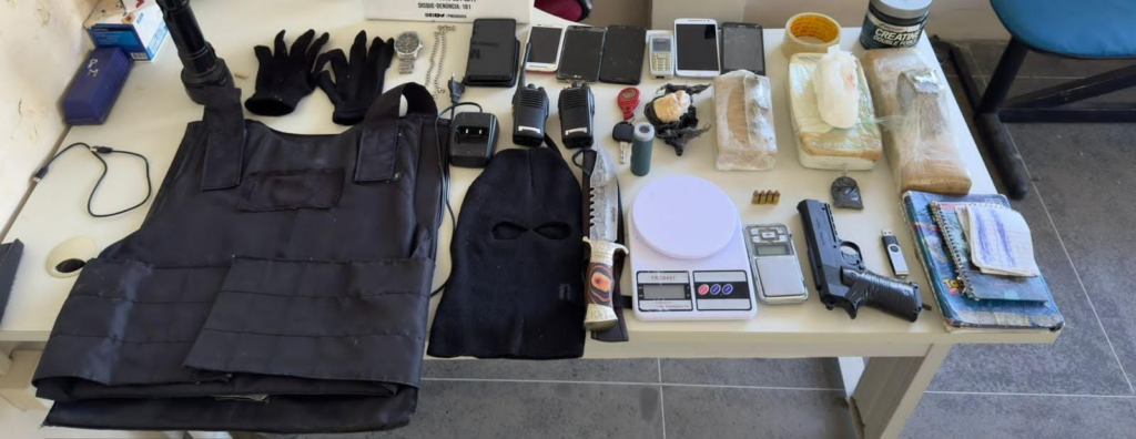 Policiais militares da 61ª CIPM apreenderam, na tarde de segunda-feira (24), um suspeito com entorpecentes, equipamentos de comunicação e uma réplica de arma de fogo, na Rua Serrinha, em Ubaitaba.