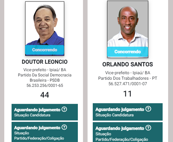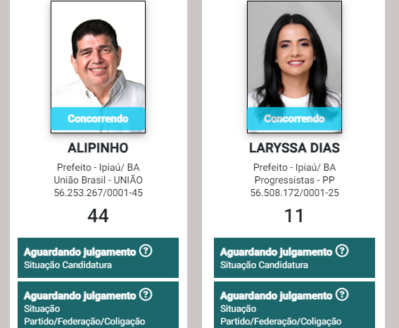 Os postulantes à prefeitura de Ipiaú, Laryssa Dias (PP) e Alipinho da Doce Mel (União Brasil), juntamente com os candidatos a vices Orlando (PT) e Doutor Leoncio (PSDB), e os postulantes ao cargo de vereador, encontram-se no aguardo da decisão do TSE. Suas candidaturas ainda estão pendentes de apreciação pela Justiça Eleitoral, conforme dados disponíveis na plataforma DivulgaCandContas, do Tribunal Superior Eleitoral (TSE). (Confira aqui)