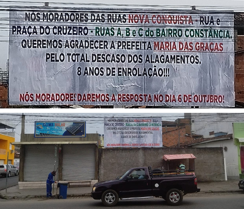 Uma imagem que viralizou hoje nas mídias digitais exibia um outdoor em que os moradores expressavam sua insatisfação com a gestão municipal de Ipiaú devido aos alagamentos ocasionados pelas chuvas nas áreas da Nova Conquista, Ruas A, B, C e E do bairro Constância e Praça do Cruzeiro. O cartaz trazia a seguinte mensagem: “Expressamos nossa indignação à prefeita Maria Das Graças pela negligência com os alagamentos, oito anos de promessas vazias. A comunidade dará sua resposta em 06 de outubro”. A Rua Nova Conquista foi inundada em 26 de dezembro de 2022 devido à enchente do Rio de Contas. Desde então, qualquer chuva intensa resultava em mais alagamentos na rua, causando problemas constantes aos residentes e motivando o protesto atual.