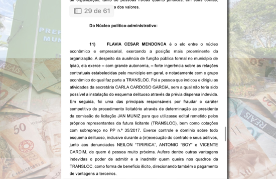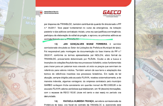 O Grupo de Atuação Especial de Combate às Organizações Criminosas e Investigações Criminais do Ministério Público da Bahia acusou os acusados de integrarem um grupo econômico-empresarial, em parceria com as empresas citadas, com o propósito de desviar verbas públicas por meio de contratos com preços inflacionados. De acordo com o GAECO, eles se valiam das empresas como “fachadas” para justificar serviços que, muitas vezes, não eram prestados ou eram cobrados acima do valor de mercado. Utilizando essas empresas, eles movimentavam os recursos visando ocultar a origem do dinheiro, configurando assim a prática de lavagem de dinheiro. Ademais, certos integrantes, como Flávia César Mendonça, exerciam funções administrativas, aproveitando suas posições de autoridade para facilitar o esquema. Flávia César Mendonça, filha da prefeita de Ipiaú, recebeu uma ordem judicial que a impede de entrar na prefeitura. ( Ipiaú TV)