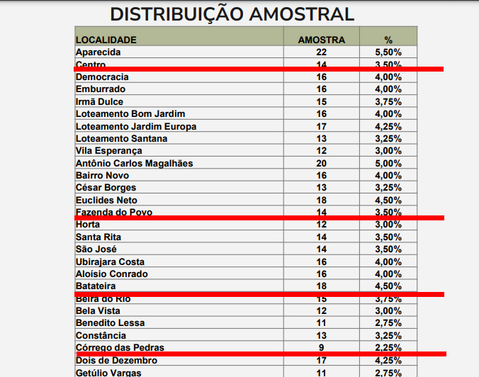 O que ocorreu foi a seleção de ruas que receberam um percentual igual ao dos bairros (confira). Por exemplo, a Rua Valter Hohlenwerger (anteriormente chamada de batateira) teve o mesmo número de respondentes que o Centro da Cidade, enquanto a Fazenda do Povo contou com mais entrevistados do que Córrego de Pedras. Essa distribuição das entrevistas resulta em um resultado que não reflete a verdadeira situação eleitoral do município.