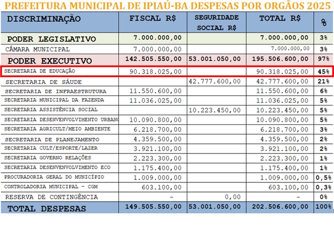 Na condição de cidadão e contribuinte, PERGUNTA o urbanista ipiauense arq. Elson Andrade, que nos traz nesta edição, uma análise detalhada e profunda, acerca do velado jogo político-orçamentário por trás da proposta da LOA-2025, quando e onde a atual administração teria alocado temporariamente, estrategicamente, de forma disfarçada, na LOA-2025, 1/4 dos recursos orçamentários, acima dos percentuais mínimos exigidos pela Constituição Federal. Mais da metade (66%) do orçamento anual, estão concentrado sob os mantos sagrados da “Educação” e “Saúde”.