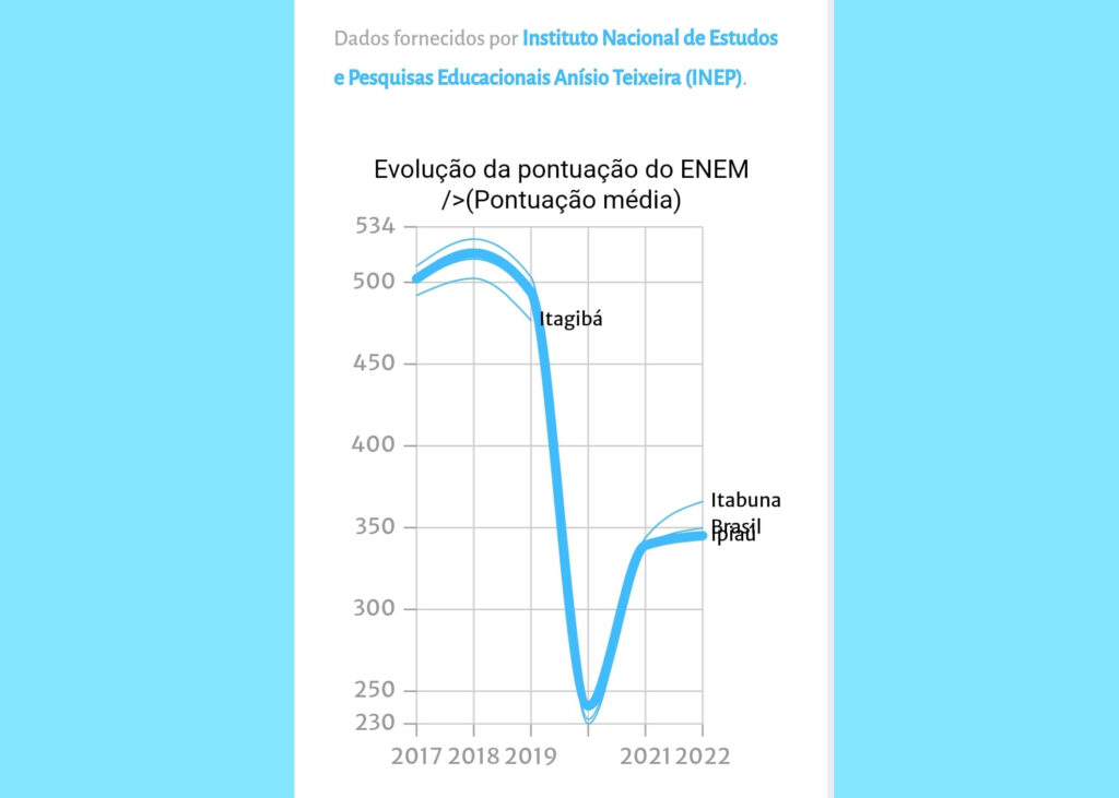 De acordo com os dados divulgados pelo Instituto Nacional de Estudos e Pesquisas Educacionais Anísio Teixeira (INEP), a média das notas do ENEM em 2022 na cidade de Ipiaú foi de 345 pontos. No entanto, esses números revelam uma realidade preocupante. As médias por área de conhecimento foram de 343 em matemática, 353 em língua portuguesa, 324 em ciências da natureza e 361 em ciências sociais.