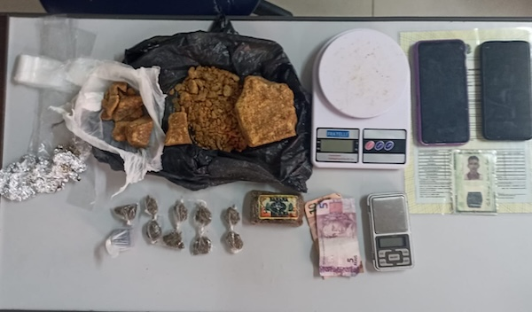 Após a apreensão inicial, os policiais se dirigiram à residência do suspeito, onde foram localizados mais entorpecentes e equipamentos possivelmente utilizados na prática de tráfico. No local, foram apreendidos 96 gramas de haxixe, 20 gramas de haxixe em outra porção, nove buchas de maconha pesando 15 gramas, aproximadamente 600 gramas de crack, além de duas balanças de precisão.