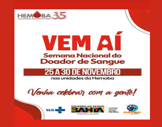 Em celebração ao Dia Nacional do Doador de Sangue e aos 35 anos da Hemoba, o Grupo de Doadores de Sangue de Ipiaú e região promove o 11° Multirão de Doação de Sangue. O evento, que visa aumentar os estoques de sangue nos hospitais e incentivar a solidariedade, ocorrerá no dia 30 de novembro, em Jequié, na Bahia.