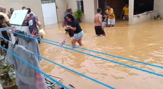 Moradores do município de Wenceslau Guimarães, no baixo-sul baiano, enfrentam transtornos após fortes chuvas registradas na noite deste sábado (23), provocando o transbordo do Rio das Almas, que corta o município e gerando alagamentos em pontos diversos. Casas localizadas em bairros nas proximidades do Rio foram invadidas pelas águas e moradores viveram momentos de apreensão. Imagens circulam nas redes sociais mostram ruas completamente alagadas. Não há informações sobre desabrigados. Nas redes sociais, a Prefeitura de Wenceslau, que ainda não divulgou detalhes sobre a enchente propagou um card, arte gráfica, alertando a população sobre novas chuvas neste domingo e pedindo atenção redobrada de quem reside em áreas de enconsta ou ribeirinhas. As informações são de que as secretarias municipais mobilizam seus prepostos para dar suporte aos afetados. Campanhas solidárias começam a ser realizadas por populares como forma de se solidarizem com as famílias atingidas. *Com informações do Blog Marcos Frahm