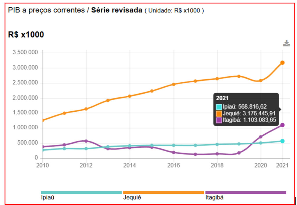 Entre 2010 e 2021, o gráfico mostra que Itagibá saiu de uma posição quase equivalente à de Ipiaú para ultrapassá-la expressivamente. Até 2014, os PIBs de ambos os municípios eram próximos, mas a curva de Itagibá ganhou força a partir de 2018, ultrapassando Ipiaú e continuando em ascensão. Enquanto isso, Jequié, maior cidade da região, seguiu como referência econômica, com um PIB de R$ 3,17 bilhões em 2021. Ainda que Jequié não enfrente concorrência direta de Itagibá ou Ipiaú, o desempenho de Itagibá é impressionante ao aproximar-se de um terço da economia jequieense.