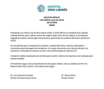 Conforme o primeiro boletim médico divulgado às 3h20 desta terça (10), Lula passou mal ainda em Brasília. Ele fez um exame de imagem após sentir dor de cabeça, ainda na unidade do hospital da capital federal.