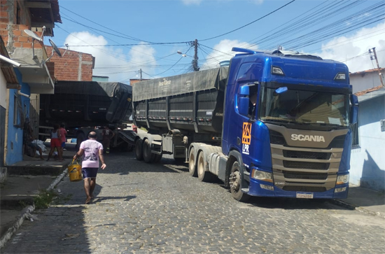 Ao tentar manobrar pelas ruas estreitas da região, o motorista pediu ajuda a um motociclista para encontrar uma saída, mas acabou colidindo com a marquise de uma residência. O veículo ficou travado entre a Rua Adenor Soares e outra via próxima, bloqueando a passagem de outros veículos e pedestres.
