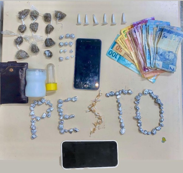 Após abordagem, a PM encontrou com o jovem uma quantidade de drogas e dinheiro. O suspeito foi imediatamente detido, e as buscas em seu imóvel, onde ele reside com a namorada, revelaram mais entorpecentes. Foram localizados pacotes com maconha, cocaína e crack, além de outros materiais associados à comercialização de drogas.
