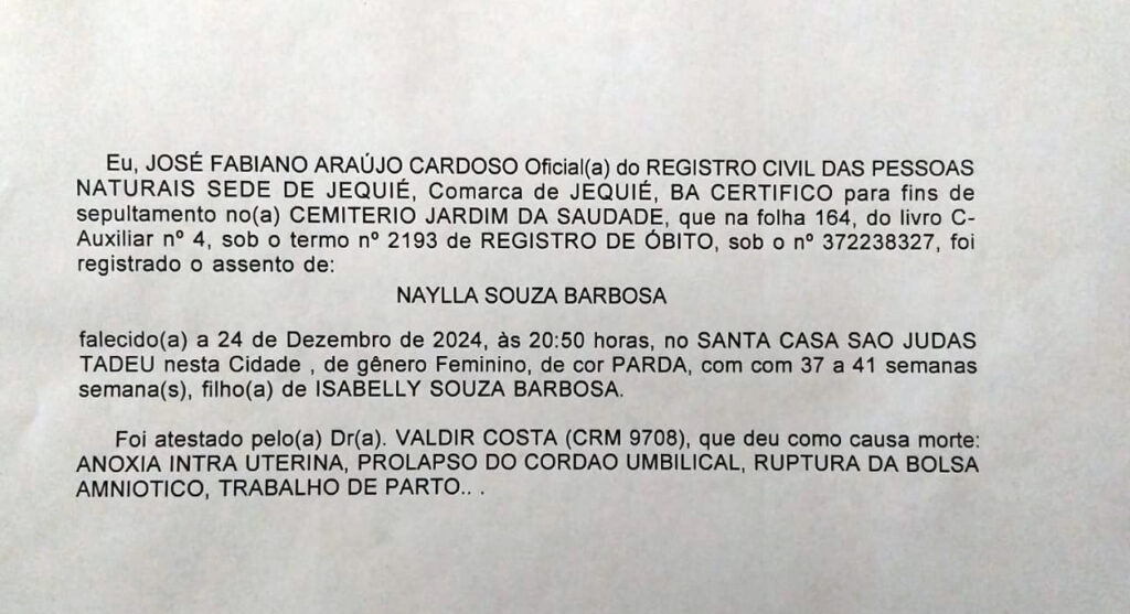 Quando a ultrassonografia foi finalmente realizada, constatou-se que o bebê, a pequena Nayla, já havia falecido. A família, desesperada, ainda solicitou a transferência de Isabelly para a Santa Casa de Misericórdia, em Jequié, mas o pedido não foi atendido a tempo de evitar a perda.