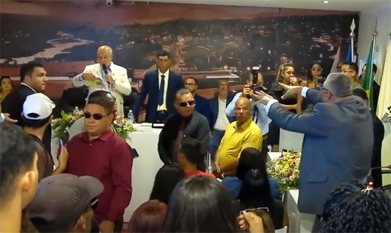 A sessão foi presidida interinamente pelo vereador Cláudio Nascimento, que solicitou a apresentação física dos diplomas de eleitos dos vereadores presentes. O pedido gerou indignação no grupo dos sete legisladores liderado por Edson Marques (Avante), também candidato à presidência. Segundo os parlamentares desse bloco, a exigência nunca havia sido feita em uma sessão de posse anterior, o que foi interpretado como uma manobra política. O impasse provocou um grande tumulto, culminando na necessidade de intervenção da Polícia Militar para controlar os ânimos e garantir a continuidade da sessão.