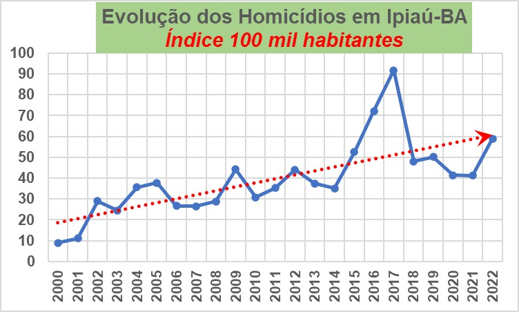Os números históricos revelam que os maiores picos de violência em Ipiaú coincidiram com períodos de governo do Partido dos Trabalhadores (PT) na Bahia, que governou o estado de 2007 a 2022. Durante esse intervalo, o índice de homicídios no município aumentou significativamente, atingindo o ápice em 2017, quando 30 homicídios foram registrados. Essa foi uma época marcada por avanços no tráfico de drogas, disputas territoriais entre facções criminosas e falta de políticas públicas eficazes para o combate à criminalidade no interior do estado.