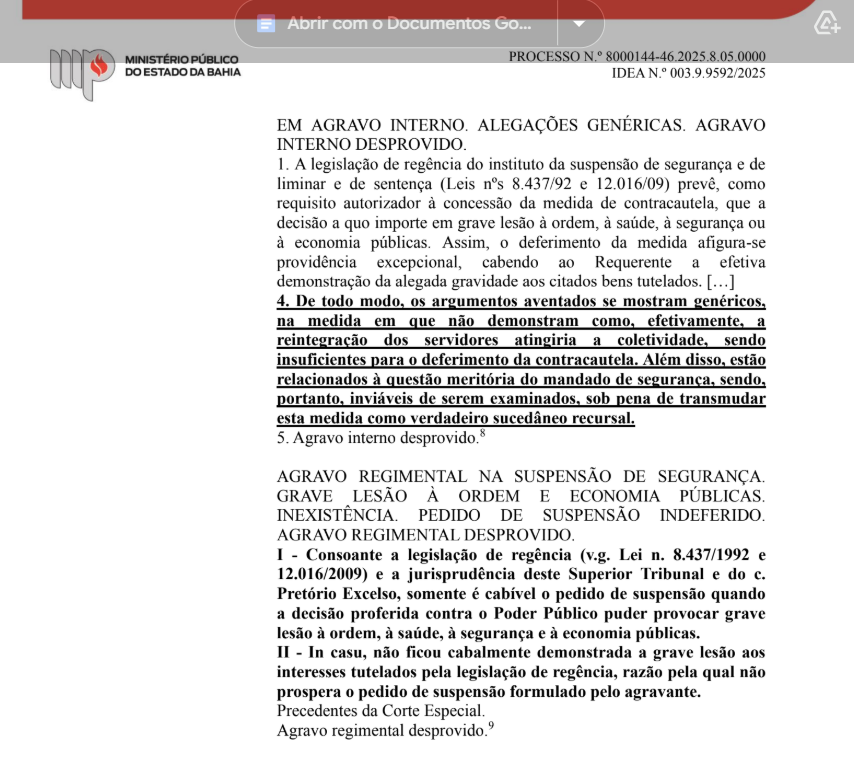 O MP também discordou da dilação do prazo concedida pela Desembargadora Presidente do TJ-BA, que havia aumentado para 15 dias o período para o cumprimento da decisão judicial. Segundo o parecer, não há comprovação de risco à ordem pública ou à segurança jurídica que justifique a medida, argumentos utilizados na decisão da magistrada.