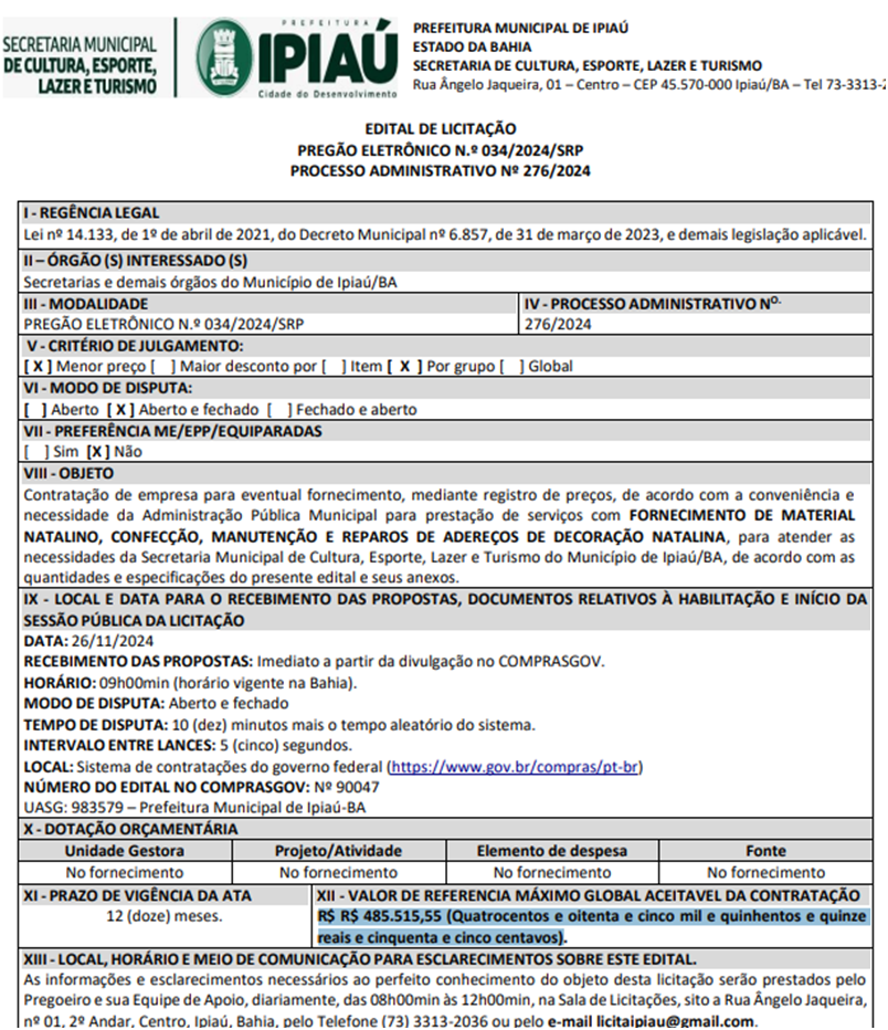 A licitação conduzida pela Secretaria Municipal de Cultura, Esporte, Lazer e Turismo com um gasto previsto de R$ 485.515,55 a qual resultou na contratação da empresa local Ricardo Barreto Medrado, popularmente conhecida como “Lojão da Construção”. Não é a primeira vez que a empresa firma contratos significativos com a administração pública de Ipiaú – Os últimos somados, os valores de serviços prestados pela mesma chegam a R$ 2.115.745,54.