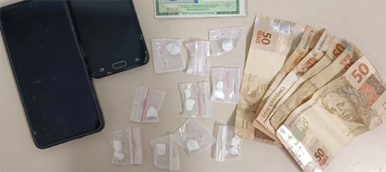 De acordo com a PM, o jovem, identificado pelas iniciais M.F.A., tentou fugir ao perceber a aproximação da viatura, mas foi alcançado pelos agentes. Durante a abordagem, os policiais encontraram com ele 10 papelotes de uma substância análoga à cocaína, além de R$ 300 em espécie. Também foram apreendidos dois celulares, sendo um da marca Poco e outro da Samsung.