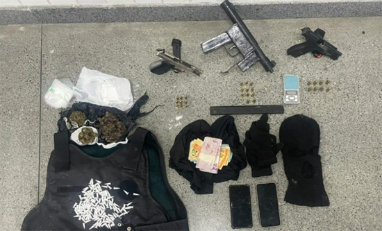 Na ocorrência de n° 90984/2025, consta que os policiais apreenderam uma série de materiais ilícitos, incluindo armas, drogas e dinheiro. Foram recolhidos R$ 865,00 em espécie, um colete balístico, 232g de cocaína, 99g de maconha, 146 eppendorfs com cocaína, além de três armas de fogo: uma pistola Taurus PT 24/7 com oito munições, uma pistola PT 58 S com nove munições e uma metralhadora artesanal calibre 9mm. Também foram apreendidos uma balança de precisão, dois celulares, três balaclavas, um par de luvas pretas e embalagens plásticas utilizadas no acondicionamento de drogas.