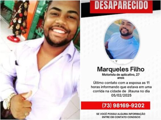 A Polícia Civil investiga o desaparecimento de Marqueles Jesus da Silva Filho, de 27 anos, motorista de aplicativo em Jequié, que está desaparecido desde a manhã do dia 5 de fevereiro.