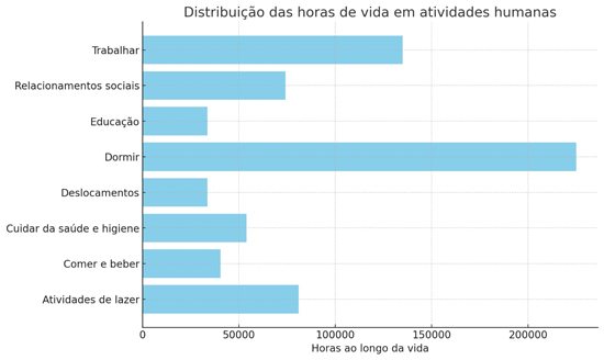 Um estudo sobre a distribuição do tempo ao longo da vida revela como as atividades humanas ocupam nossa existência. De acordo com o gráfico analisado, dormir é a atividade que consome a maior parte do tempo de uma pessoa, com mais de 200 mil horas dedicadas ao repouso. Trabalhar ocupa a segunda maior parcela, seguido por lazer e relacionamentos sociais.