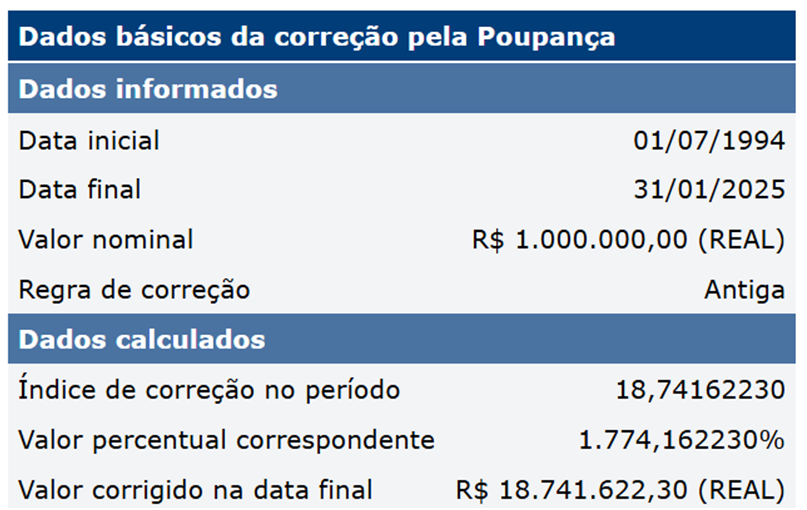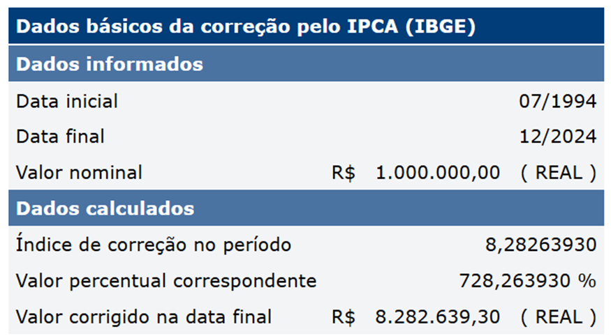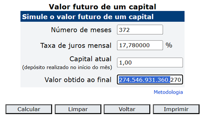 Abaixo temos o pornográfico resultado aferido pela calculadora do Banco Central do Brasil, que atingiu R$ 274.546.931.360.270.082.121.924.608,00(duzentos e setenta e quatro sextilhões, quinhentos e quarenta e seis quintilhões, novecentos e trinta e um quatrilhões, trezentos e sessenta trilhões, duzentos e setenta bilhões, oitenta e dois milhões, cento e vinte e um mil, novecentos e vinte e quatro reais e seiscentos e oito centavos).