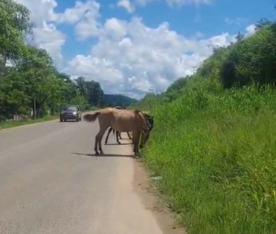A presença recorrente de animais soltos na rodovia tem sido alvo de preocupação entre motoristas e moradores da região. Além de representar perigo para quem trafega pelo local, a situação evidencia a falta de fiscalização e responsabilidade dos proprietários dos animais.
