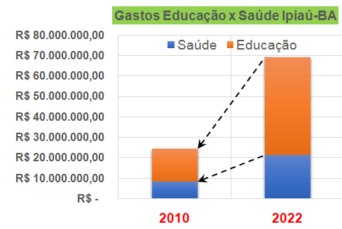 Em 2010, os gastos com Saúde eram de R$ 8.374.123,81, enquanto em 2022 atingiram R$ 21.319.873,23, representando um aumento de 193%. Da mesma forma, os gastos com Educação passaram de R$ 16.132.251,14 em 2010 para R$ 47.687.718,80 em 2022, um aumento de 224%.