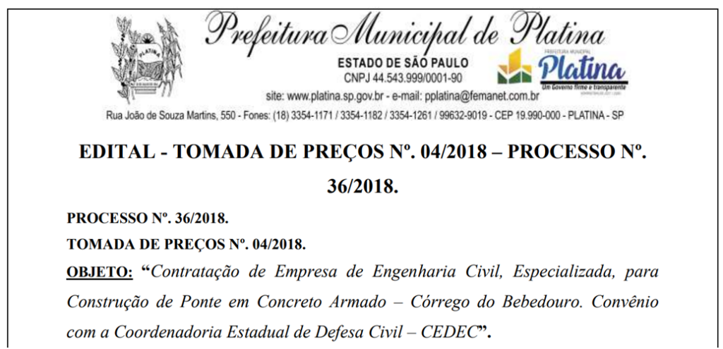 Caso notório, em que a prefeiturapublicou tudo diretamente pela própria Secretaria de Comunicação local, sem gastar um centavo com publicidade terceirizada parceira, quando oportunamente justificou o investimento: – “A nova ponte será mais larga proporcionando assim um melhor tráfego, inclusive de máquinas agrícolas pesadas. A obra foi orçada em R$ 222.273,13”. E encerrouo caso de forma simples e direta, com o slogan: – “Prefeitura Municipal de Platina, um Governo Firme e Transparente”.