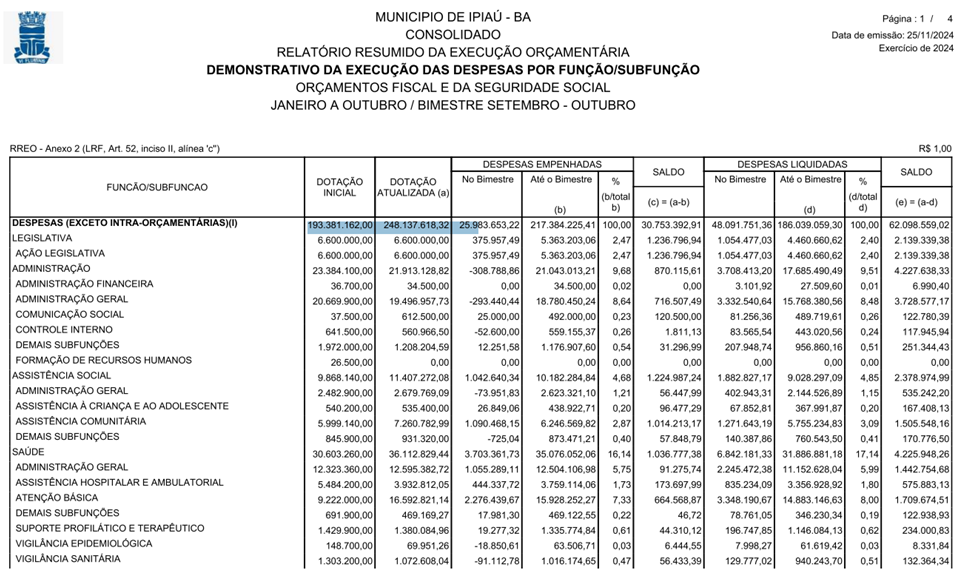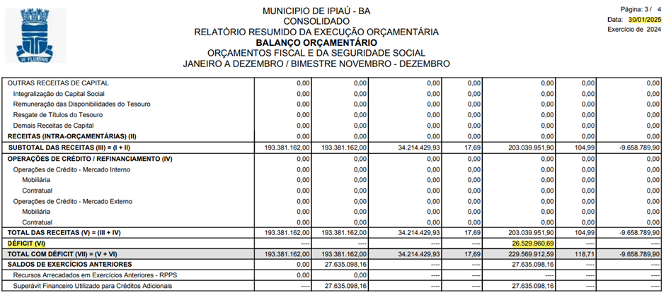 A administração chegou a divulgar que teria gasto R$ 320 milhões e arrecadado R$ 282 milhões. O leitor pode conferir a publicação original nos links a seguir : Prefeitura Municipal de Ipiaú Despesas 2024, Prefeitura Municipal de Ipiaú Receitas 2024 (1) (1)