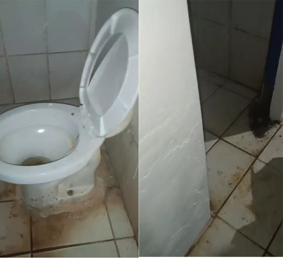 De acordo com o relato, o banheiro encontra-se em estado deplorável e totalmente sem condições de uso. A situação é tão grave que o espaço está trancado, impedindo o acesso até mesmo de visitantes que vêm de comunidades e cidades vizinhas durante as feiras e festividades.
