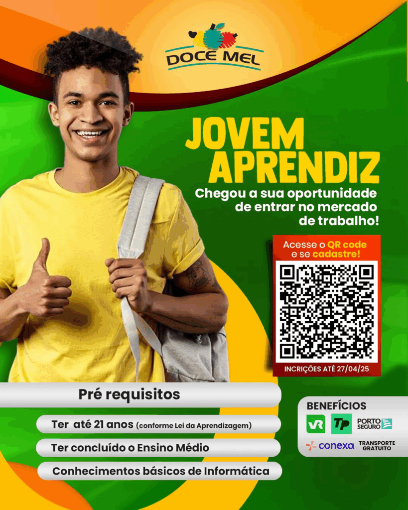 A empresa Doce Mel está com inscrições abertas para o seu programa Jovem Aprendiz, oferecendo uma excelente oportunidade para jovens que desejam ingressar no mercado de trabalho. Com prazo até o dia 27 de abril, os interessados devem se cadastrar por meio do QR Code disponível no material de divulgação ou clicando aqui ! .
