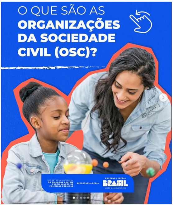 “As Organizações da Sociedade Civil – OSC são entidades sem fins lucrativos que objetivam cooperar com o Estado, de forma suplementar, no atendimento ao interesse público, visando produzir transformações mediante a promoção de direitos sociais, a conscientização socioambiental e o combate à exclusão social.”