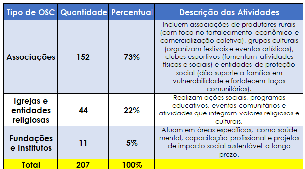 As associações, que representam a maioria das OSC de Ipiaú, abrangem uma gama variada de atividades: