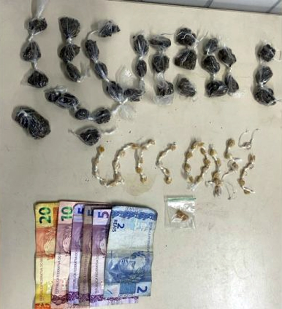 Com a autorização do suspeito, os policiais seguiram até o imóvel, onde foram localizadas 34 buchas de maconha, 43 pedras de crack, uma pedra de crack de tamanho maior, além de R$ 47 em dinheiro.