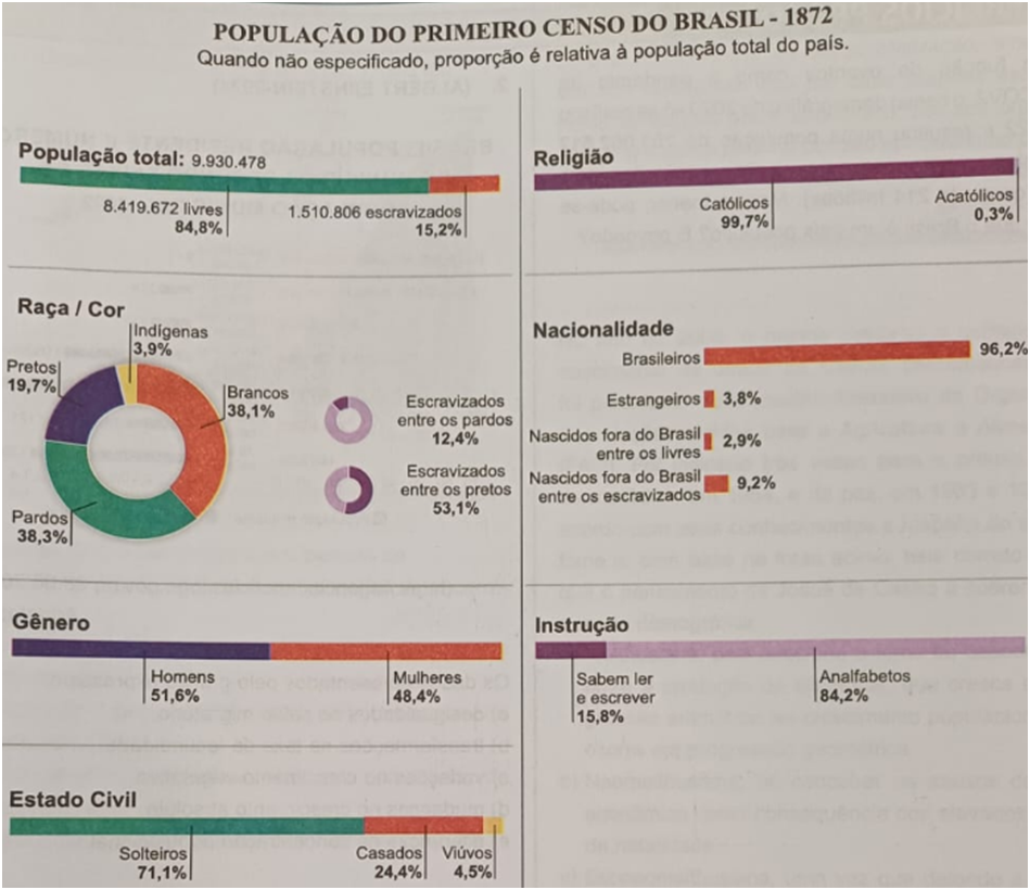 O Censo de 1872 foi o primeiro levantamento populacional oficial do Brasil e traz números surpreendentes, que desafiam a narrativa comum dos livros sobre a real condição dos negros no século XIX. Apesar de o país ainda viver sob o regime escravocrata, os dados revelam que a maioria da população negra já era livre. Além disso, mostram que a pobreza e o analfabetismo afetavam amplamente toda a sociedade, sendo, portanto, um problema muito maior e mais abrangente do que se costuma imaginar. Sob o ponto de vista socioeconômico, esses males impactaram — e de certo modo ainda impactam — não apenas os negros, mas diversos grupos sociais.