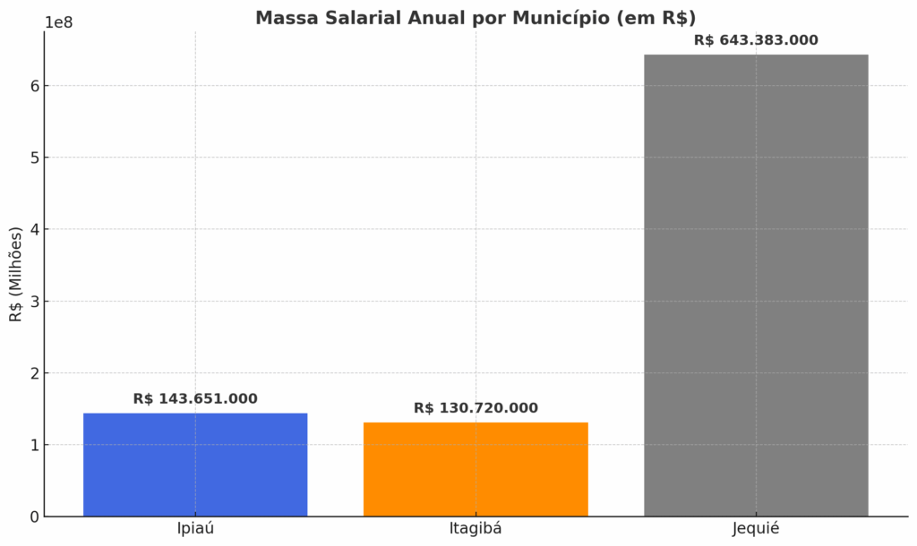 Já Itagibá, mesmo com uma média salarial mais alta (2,8 salários mínimos), possui um volume menor de pessoas ocupadas (3.077), o que resulta em uma massa salarial anual inferior: R$ 130.720.000, representando 14% da soma regional.