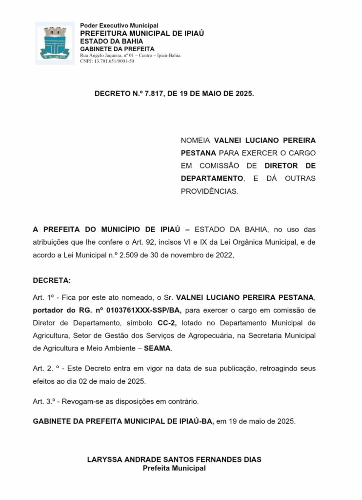 Foi publicado no Diário Oficial do Município de Ipiaú, em 19 de maio, o Decreto nº 7.817/2025, nomeando Valnei Luciano Pereira Pestana para o cargo comissionado de Diretor de Departamento, símbolo CC-2, vinculado ao Departamento Municipal de Agricultura, setor da Secretaria Municipal de Agricultura e Meio Ambiente (SEAMA).
