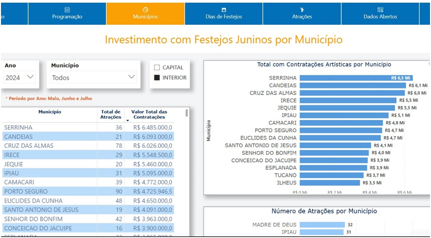 A cada ano, os festejos juninos movimentam milhões de reais nos municípios baianos, mas a transparência sobre esses gastos ainda gera questionamentos. Dados do Painel de Transparência dos Festejos Juninos nos Municípios Baianos 2024, disponibilizados pelo Ministério Público da Bahia (MP-BA) — https://paineljunino.mpba.mp.br — revelam que 331 municípios prestaram contas sobre suas festividades, totalizando 4.305 shows contratados em um curtíssimo período.
