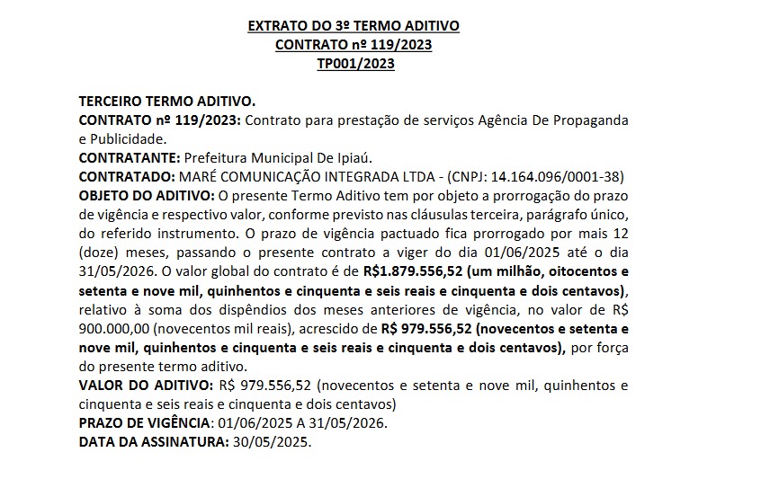 A Prefeitura Municipal de Ipiaú prorrogou por mais 12 meses o contrato com a agência Maré Comunicação Integrada LTDA, responsável pela prestação de serviços de publicidade institucional. A decisão foi oficializada por meio do 3º Termo Aditivo ao Contrato nº 119/2023 (TP001/2023), assinado em 30 de maio de 2025.