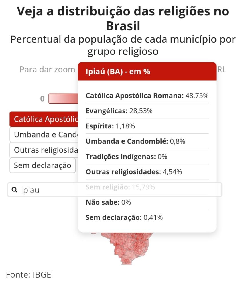 Os números divulgados pelo IBGE sobre a distribuição religiosa em Ipiaú revelam uma mudança silenciosa — e que pode estar mexendo com as bases tradicionais da cidade. Embora o catolicismo ainda lidere, com 48,75% da população se declarando católica, o avanço das igrejas evangélicas (28,53%) e o surpreendente número de pessoas que dizem não ter religião (15,79%) estão provocando debates acalorados em rodas de conversa, redes sociais e até nos púlpitos.