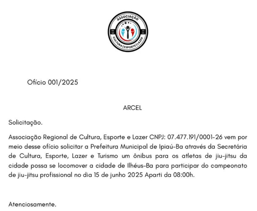 A Associação Regional de Cultura, Esporte e Lazer (ARCEL) encaminhou à Prefeitura Municipal de Ipiaú o ofício nº 001/2025 solicitando apoio logístico para o deslocamento de atletas de jiu-jitsu até a cidade de Ilhéus, onde será realizado um campeonato profissional da modalidade no próximo dia 15 de junho (domingo), com início previsto para as 08h.