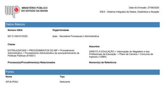 Na realidade, foi instaurado pela Promotoria de Justiça de Ipiaú, o Procedimento Administrativo nº 657.9.169147/2025, de natureza preventiva e de acompanhamento, em atendimento à uma Recomendação emitida pela Procuradoria-Geral de Justiça do Estado da Bahia, que visa intensificar a fiscalização das políticas públicas educacionais em TODOS os municípios baianos.