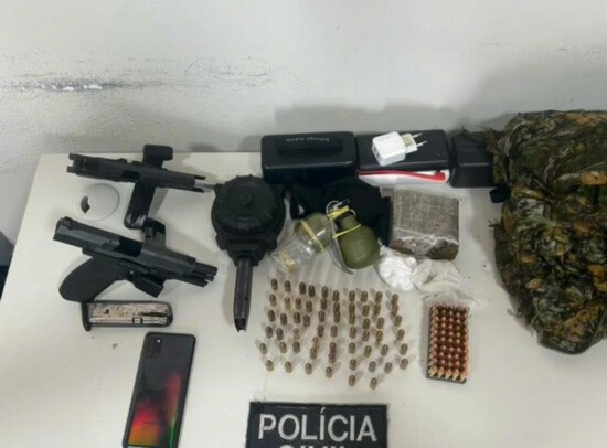 Durante a varredura no acampamento improvisado, os policiais localizaram e apreenderam um verdadeiro arsenal: duas pistolas calibre 9mm de origem tcheca (CZ – Cezkia Zbrojovka) com numeração suprimida, um carregador tipo caracol com capacidade para 50 munições, três granadas, 106 munições calibre 9mm, além de 300g de maconha, uma pedra de crack de aproximadamente 80g, roupas camufladas, dois carregadores portáteis de celular e um aparelho celular.