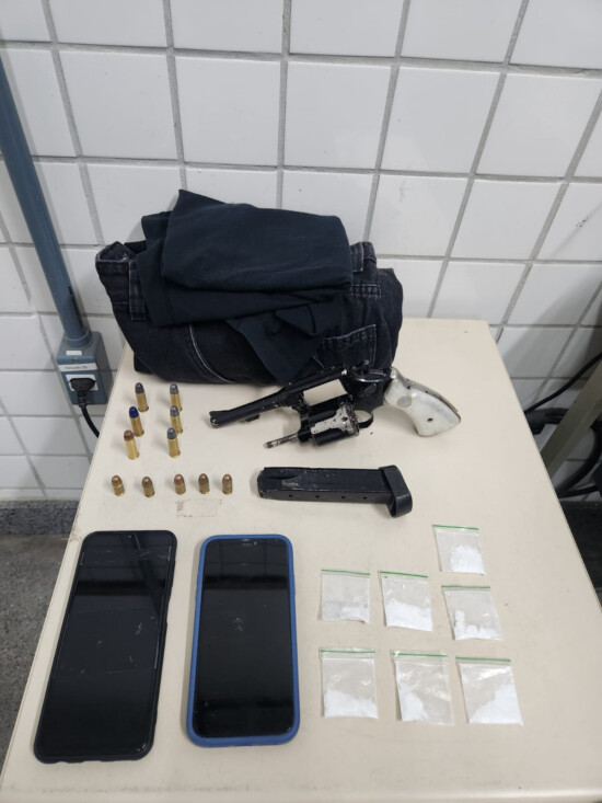 Na abordagem, os policiais encontraram com os suspeitos um revólver calibre .38 com numeração suprimida, um carregador de pistola calibre .380, além de munições e pequenas porções de drogas. Os homens também portavam dois aparelhos celulares, que serão periciados para auxiliar nas investigações.