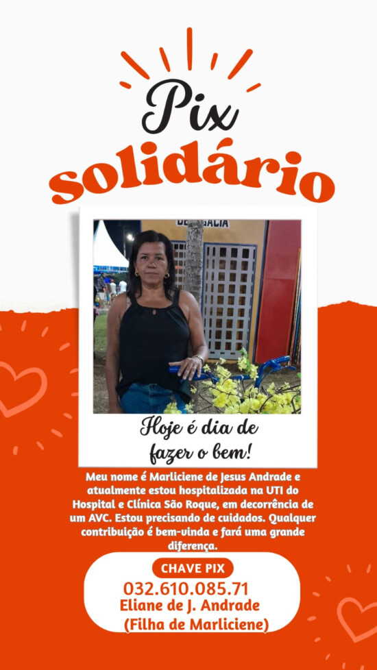 A filha de Marliciene, Eliane de Jesus Andrade, sensibilizada pela situação, disponibilizou uma chave Pix para facilitar as doações. “Qualquer contribuição, por menor que pareça, fará uma grande diferença nesse momento difícil”, destacou a família, apelando para a generosidade da comunidade.