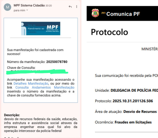 A denúncia foi protocolada em 31 de outubro de 2025, por Hugo Ricardo dos Santos, bacharel em direito, morador do distrito de Japumerim, Protocolo: 2025.10.31.201126.506, sendo recebida pela Delegacia de Polícia Federal em Ilhéus (DPF/ILS/BA), com a área de atuação definida como “Desvio de Recursos Públicos” e a ocorrência principal classificada como “Fraudes em licitações”. É crucial destacar que a pessoa ou grupo que reuniu as informações e levou o caso ao conhecimento das autoridades atuou como comunicante. A partir deste protocolo, a responsabilidade legal pela condução do inquérito é exclusiva da Polícia Federal e do Ministério Público Federal, Número da manifestação: 20250078780, cabendo a esses órgãos a coleta, a análise e a comprovação (ou refutação) dos fatos, bem como o eventual oferecimento de denúncia à Justiça.
