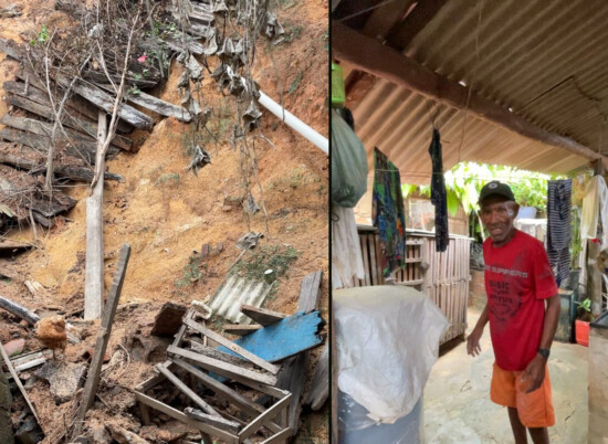 Na Rua Bom Sossego, um barranco cedeu nos fundos de algumas residências, deixando famílias em alerta. O morador Valdeque Gomes, de 52 anos, contou que o deslizamento ocorreu durante a chuva intensa. “Quando cheguei, já vi muita terra descendo e água entrando em casa. Coloquei os móveis para cima, com medo de descer tudo. Moro aqui há mais de 40 anos e nunca tinha visto isso acontecer”, relatou. Segundo ele, o Corpo de Bombeiros esteve no local, mas apenas orientou sobre os riscos.