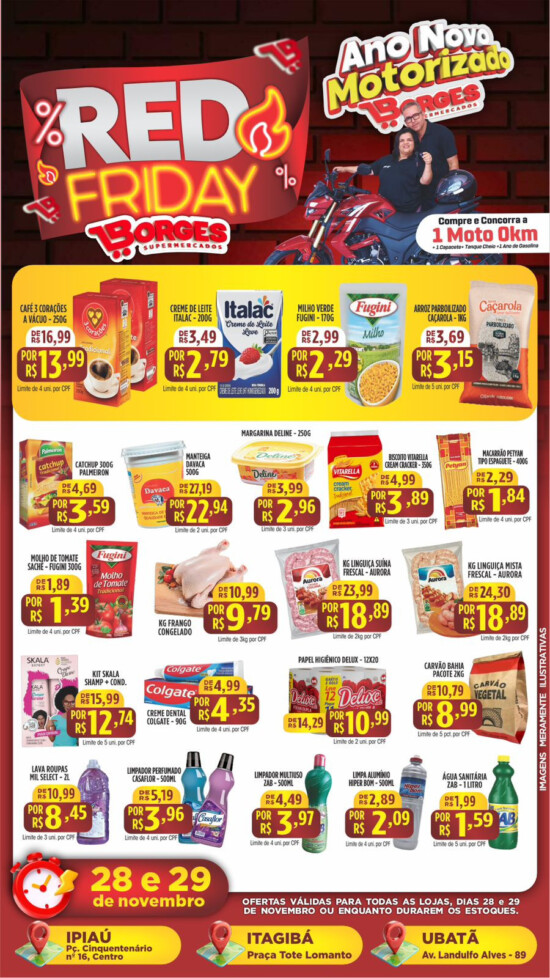 O Supermercado Borges iniciou, nesta semana, a campanha “Red Friday”, trazendo uma série de ofertas especiais válidas exclusivamente nos dias 28 e 29 de novembro nas unidades de Ipiaú, Itagibá e Ubatã. Além dos preços promocionais, os clientes ainda poderão participar da ação “Ano Novo Motorizado”, que sorteará 1 moto zero quilômetro, com capacete, tanque cheio e um ano de gasolina.