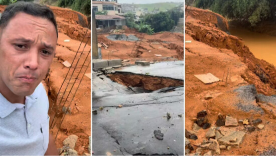 O cenário de destruição foi compartilhado pelo próprio vice-prefeito em suas redes sociais. As imagens revelam que a força das águas provocou uma erosão severa, engolindo parte da rua e derrubando completamente o muro da propriedade onde ele residia com a esposa e os filhos. Embora as paredes da casa ainda sustentem a estrutura, o solo apresenta rachaduras profundas que inviabilizam a permanência da família no local.