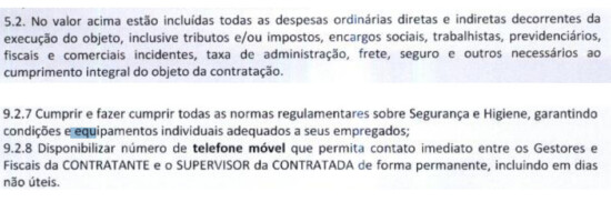 O texto diz: No valor do contrato já estão incluídos todos os “encargos sociais, trabalhistas, previdenciários” e a empresa deve garantir “condições e equipamentos individuais adequados a seus empregados”