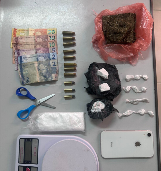 Durante as buscas, foram encontradas diversas porções de cocaína, incluindo unidades maiores e fracionadas, além de maconha prensada. Também foram apreendidas munições de calibres .38 e .32, uma balança de precisão, embalagens utilizadas para acondicionamento de drogas, a quantia de R$ 49 em espécie, um aparelho celular e outros objetos.